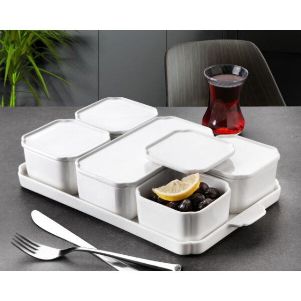 6'LI KAHVALTILIK SETİÜrün Özellikleri6'lı Kahvaltılık Seti, kahvaltı sofralarınızı düzenli ve şık hale getiren zarif bir sunum çözümüdür. Yüksek kaliteli porselenden üretilmiş bu set, farklı yiyecekleri ayrı bölmelerde saklamanızı sağlar. 5 adet kahvaltılık kabı ve bir adet tepsisi bulunur. Kapaklı tasarımı sayesinde kahvaltılıklarınızı uzun süre taze tutar. Geniş servis tepsisi ile kolay taşınabilir ve mutfakta düzen sağlar. Hem günlük kullanım hem de misafir ağırlamak için ideal bir üründür.Paket İçeriği1 Adet 6'lı Kahvaltılık Seti