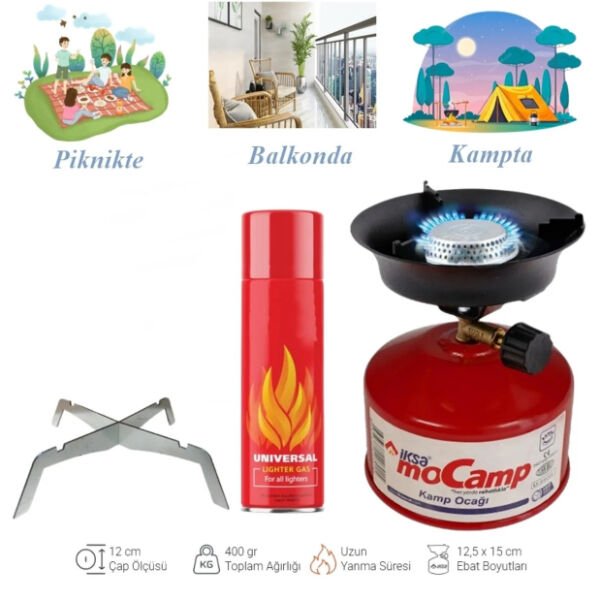 KAMP OCAĞI SETİÜrün ÖzellikleriKamp ocağı seti, taşınabilir ve kompakt yapısıyla outdoor aktivitelerinizde mükemmel bir yardımcıdır. 12 cm çapındaki pişirme alanı, tencere ve tava kullanımı için uygundur. Toplam ağırlığı yaklaşık 400 gram olan bu set, hafif ve pratik bir kullanım sunar. Universal çakmak gazı tüpü ile çalışır ve setin içinde yer alır. Ayarlanabilir alev gücü sayesinde düşükten yükseğe kontrollü pişirme yapabilirsiniz. Dayanıklı metal gövde ve plastik gaz vanası ile uzun ömürlüdür. Piknik, kamp, doğa yürüyüşleri ve acil durumlar için idealdir. Yanma süresi, yakıt kapasitesine bağlı olarak uzun süreli kullanım sağlar.Paket İçeriği1 Adet Kamp Ocağı1 Adet Universal Çakmak Gazı Tüpü1 Adet Metal Üç Ayaklı Denge Aparatı