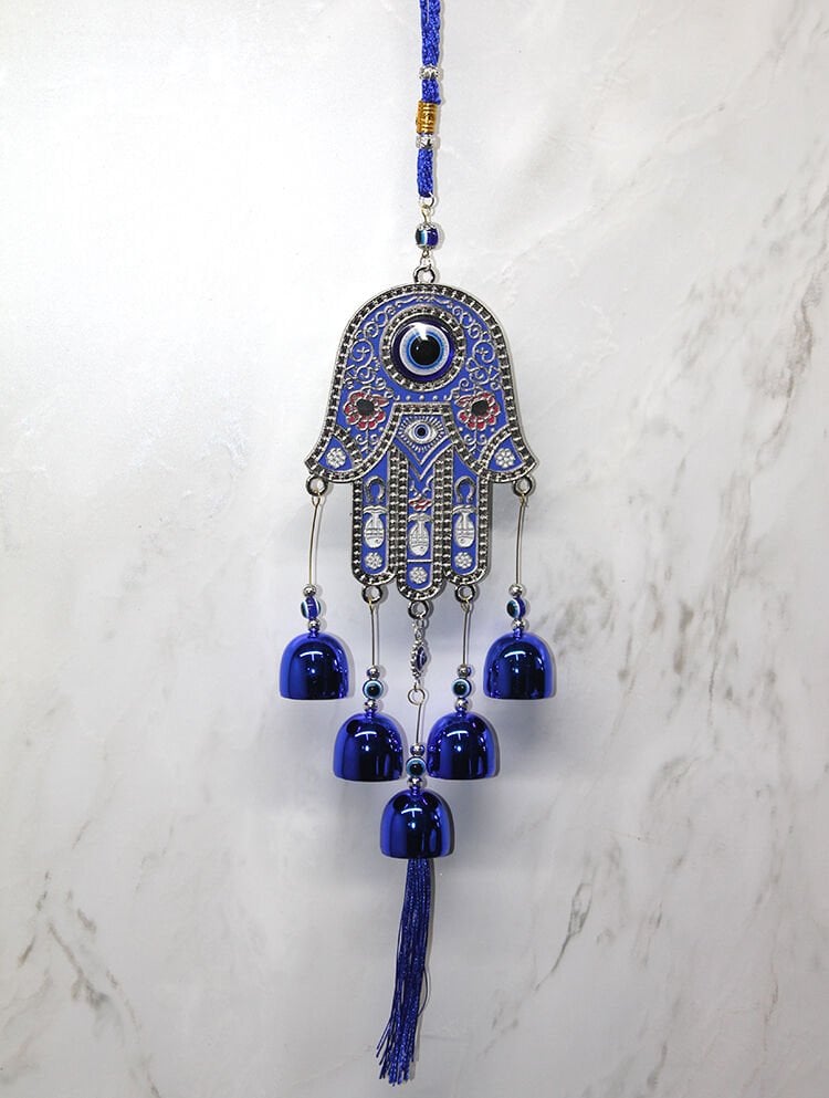 Metal Nazar Boncuğu Çan Model 8, mistik Fatma Ana Eli figürüyle dikkat çeken özel bir tasarıma sahiptir. Nazar boncuğu detayıyla negatif enerjileri uzaklaştırdığına inanılan bu çan, zarif işlemeleri ve metal çanlarıyla dekoratif bir görünüme sahiptir. Kapı, pencere, bahçe veya duvara kolayca asılabilen bu ürün, dayanıklı metal malzemeden üretilmiştir. Ortama huzurlu bir tını yayarak dekorasyonunuzu tamamlayan mistik bir aksesuardır.