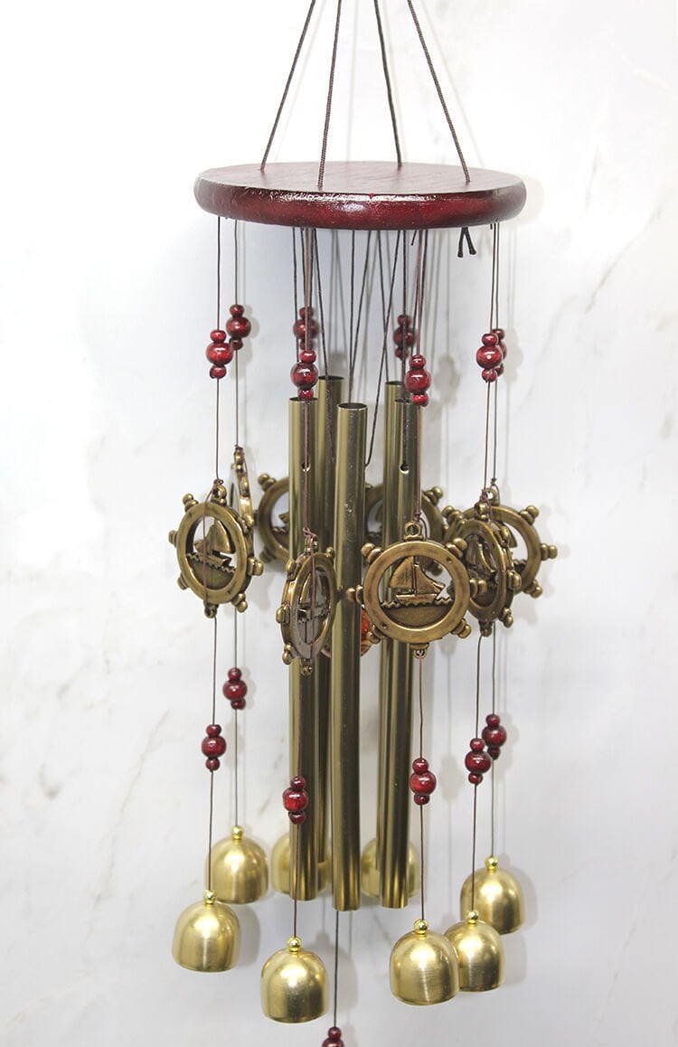 METAL RÜZGAR ÇANI MODEL 6Ürün ÖzellikleriMetal Rüzgar Çanı Model 6, eskitme bronz tonlarında metal borular ve gemi dümeni figürleriyle tasarlanmış dekoratif bir üründür. Ahşap üst kısmı, dayanıklı ipleri ve metal çanları ile estetik ve kaliteli bir görünüm sunar. Hafif rüzgarlarla birlikte çıkardığı melodik sesler, ortamınıza huzur ve dinginlik katarken, bahçe, balkon veya iç mekan dekorasyonunda şık bir aksesuar olarak kullanılabilir.Paket İçeriği1 Adet Metal Rüzgar Çanı