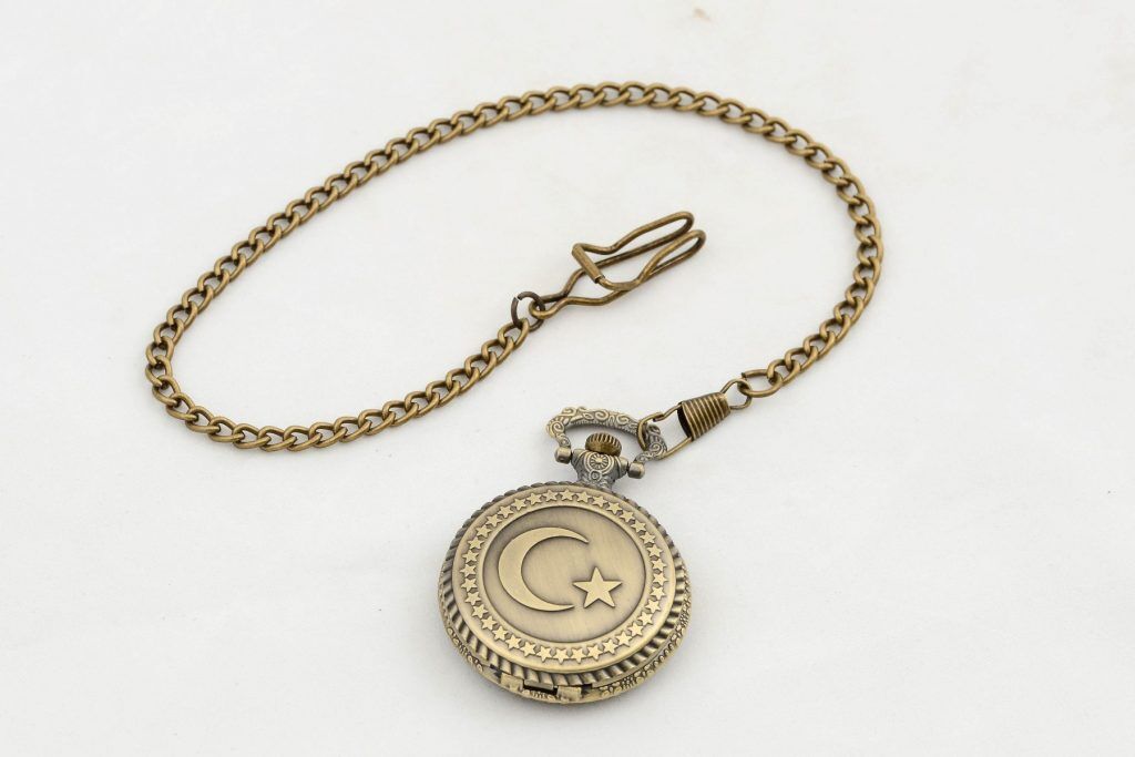 TÜRK BAYRAKLI KÖSTEKLİ SAATÜrün ÖzellikleriTürk bayraklı köstekli saat, nostaljik tasarımı ve detaylı işçiliği ile klasik saat severler için şık bir aksesuardır. Metal gövdeye sahip olup, kapağında ay ve yıldız motifi yer almaktadır. Zincirli yapısı sayesinde cepte taşınabilir ve özel günlerde kullanıma uygundur. Antik bronz renkli kaplama, saate vintage bir hava katar. Hem koleksiyonluk bir obje hem de anlamlı bir hediye alternatifi olarak tercih edilebilir.Paket İçeriği1 adet Türk Bayraklı Köstekli Saat